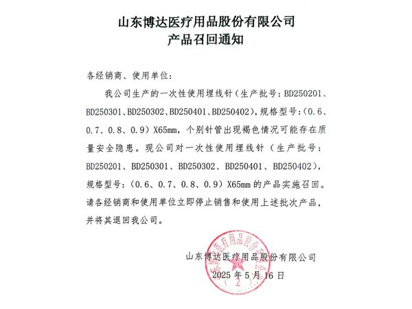 山東博達(dá)醫(yī)療用品股份有限公司 產(chǎn)品召回通知...